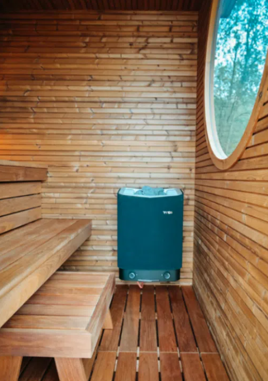 Sa fenêtre circulaire Enso, inspirée de la philosophie zen, diffuse une lumière naturelle tout en préservant l’intimité. Son bardage contemporain et ses matériaux haut de gamme — bois thermotraité et toiture métallique résistante — assurent solidité et durabilité. L’éclairage LED intégré instaure une atmosphère douce et apaisante, tandis que son système de chauffage performant garantit une montée en température rapide et un confort optimal en toute saison.